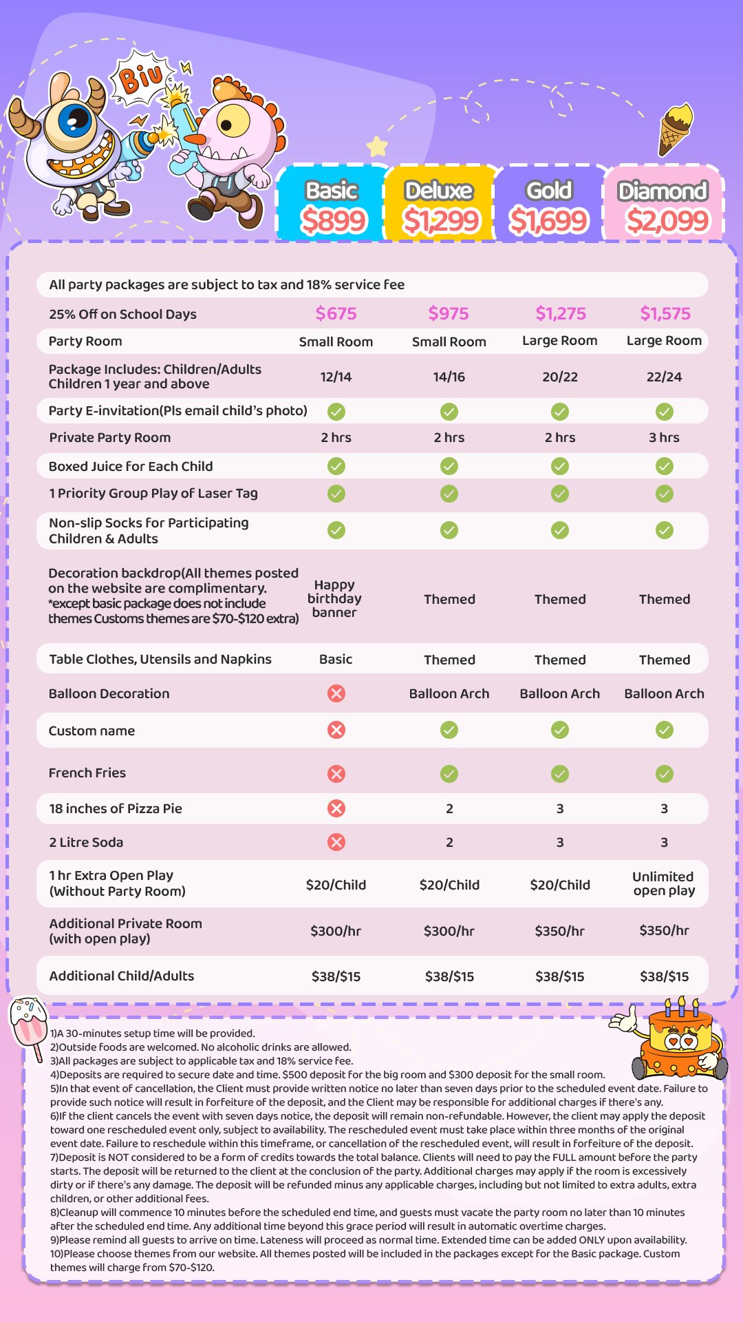 7)Deposit is NOT considered to be a form of credits towards the total balance. Clients will need to pay the FULL amount before the party starts. The deposit will be returned to the client at the conclusion of the party. Additional charges may apply if the room is excessively dirty or if there’s any damage. The deposit will be refunded minus any applicable charges, including but not limited to extra adults, extra children, or other additional fees.